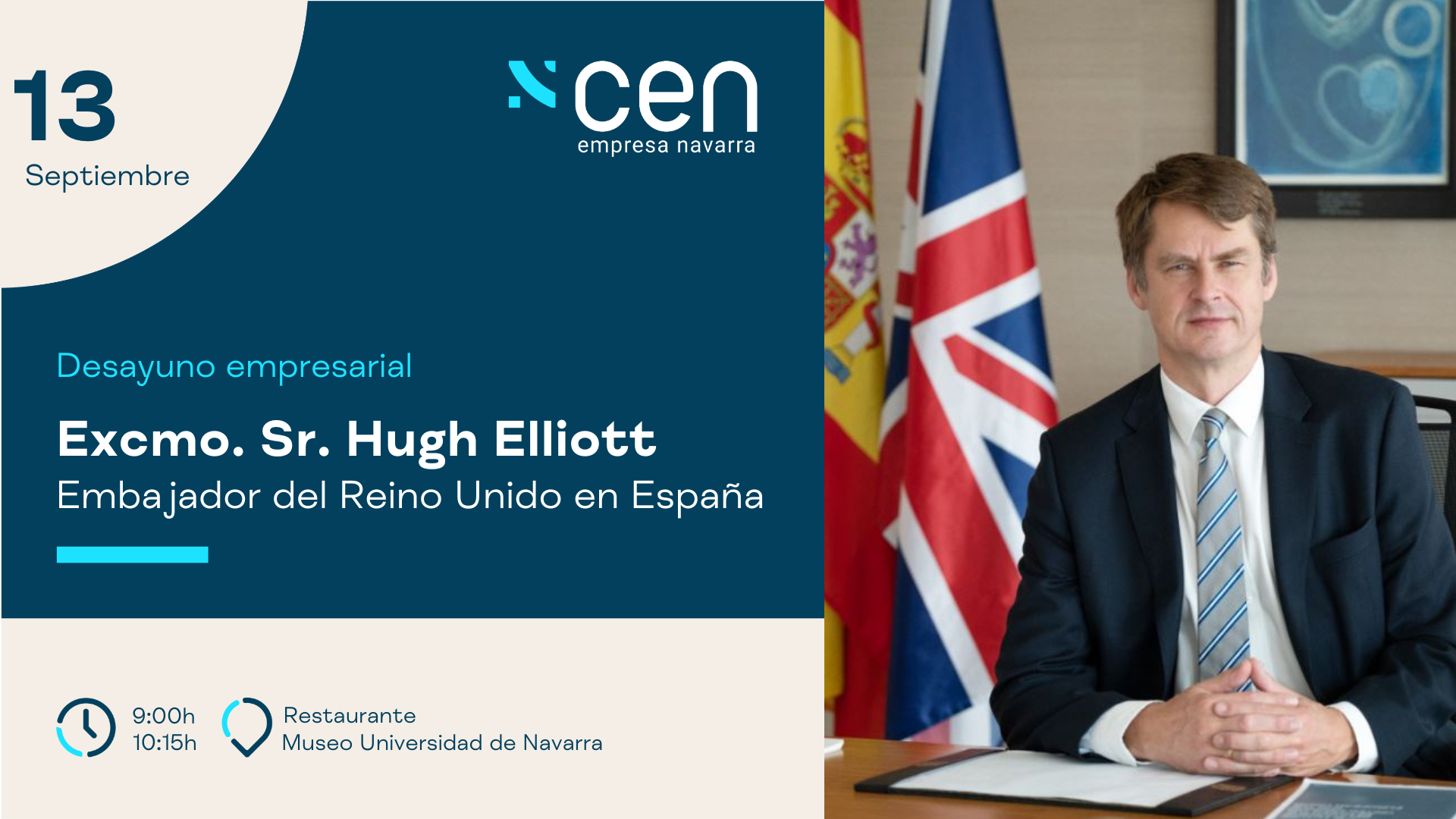 El próximo 13 de septiembre, desde CEN, hemos organizado un encuentro empresarial con el embajador de Reino Unido en España, Excmo. Sr. Hugh Elliott.