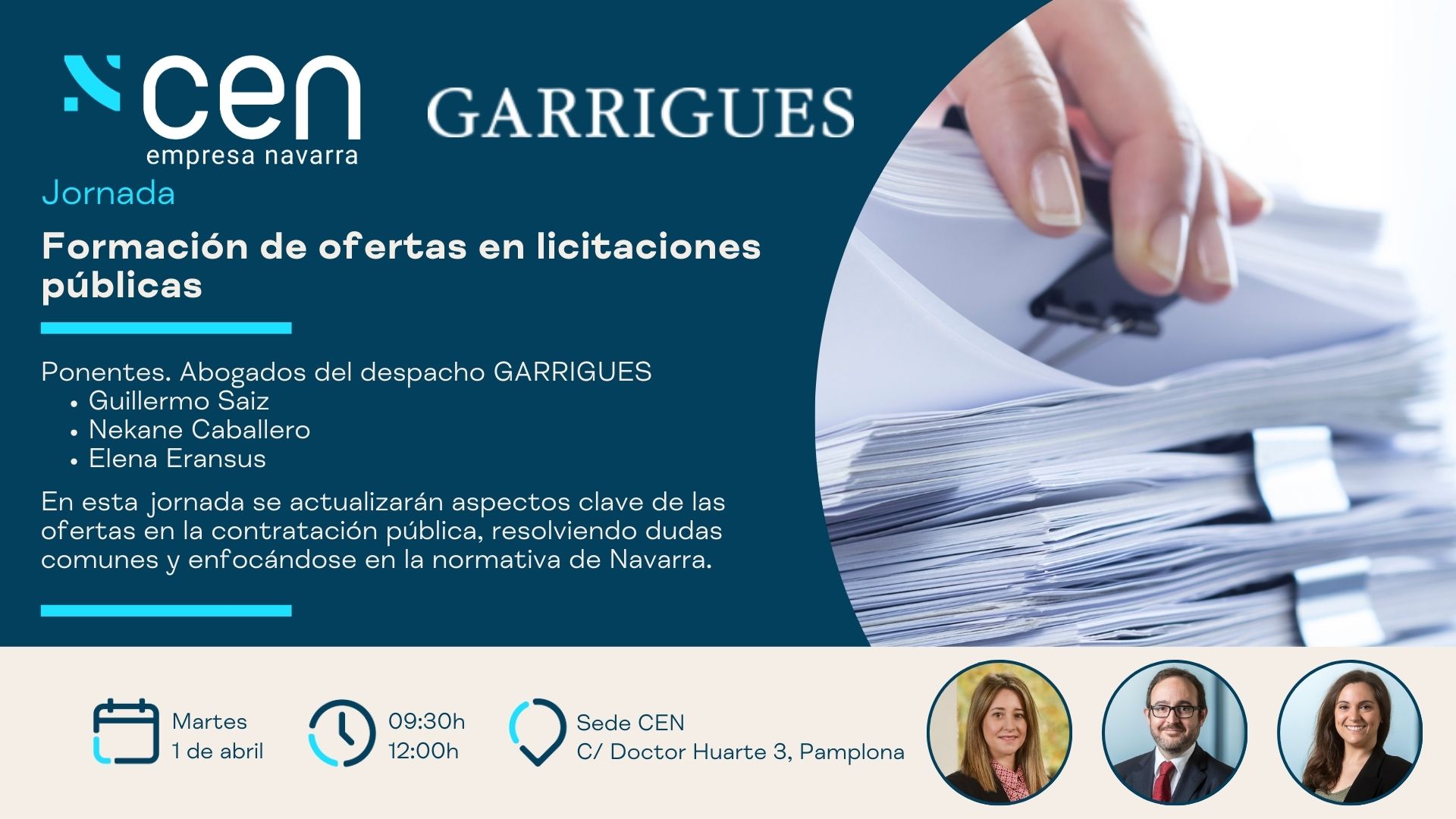 Desde la Confederación Empresarial Navarra, organizamos esta jornada, en colaboración con GARRIGUES en la que tendremos la oportunidad de repasar y actualizar aspectos clave que afectan a la configuración de las ofertas en los procedimientos de contratación pública, con un formato práctico, basado en casos reales de máxima actualidad y orientado a resolver las dudas y problemas más habituales que se plantean a los intervinientes en licitaciones públicas, con especial referencia a la normativa de contratación pública Navarra. Entre otras cuestiones, se tratarán las siguientes: