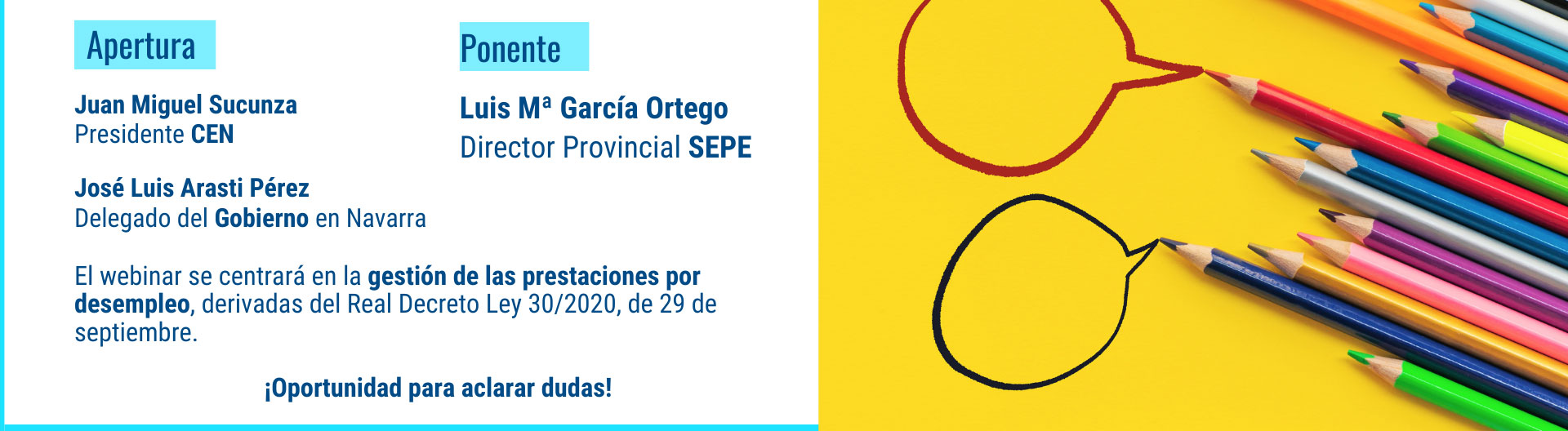 Webinar Tramitación de prestaciones por ERTE, organizado por CEN en colaboración con la dirección provincial del Servicio Público de Empleo Estatal en Navarra. Nos acompañará en la apertura el Delegado del Gobierno en Navarra, José Luis Arasti.